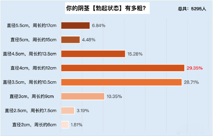 我们针对“粗细”进行过一项调查,共计5295名丁友参与。zui后的结果如下图所示: